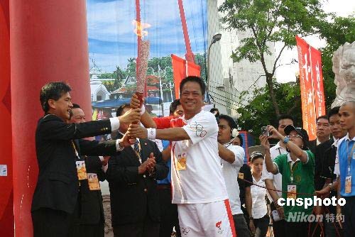 4月19日下午3時15分,祖籍中國海南的泰國第二代華裔阿南·詩里帕差臘蓬從曼谷市市長阿皮拉手中接過“祥云”火炬,北京奧運(yùn)圣火在此間的傳遞正式開始。北京奧運(yùn)圣火在曼谷的傳遞約10.8公里,共有80名火炬手,其中泰籍華人占一半以上。火炬自唐人街中華門出發(fā)后,途經(jīng)臥佛寺、大王宮、民主紀(jì)念碑、集拉達(dá)王宮、阿南達(dá)王宮等曼谷著名景點(diǎn)后,最終在五世王銅像廣場舉行慶典儀式。圖為阿南·詩里帕差臘蓬(右)從曼谷市市長阿皮拉手中接過“祥云”火炬。 中新社發(fā) 沈晨 攝