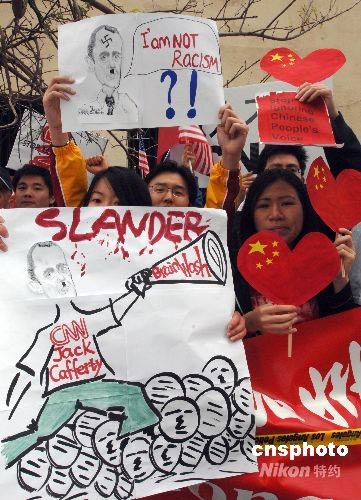 當?shù)貢r間4月19日,洛杉磯爆發(fā)十幾年來最大規(guī)模的華人華僑抗議示威活動。數(shù)千名華人華僑和留學生在CNN洛杉磯分部門前參加和平示威,要求CNN向公開鄭重道歉,并開除卡弗蒂。圖為抗議者打出漫畫諷刺卡弗蒂利用手中話筒進行“洗腦”。中新社發(fā) 張煒 攝