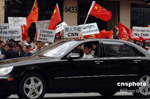 當(dāng)?shù)貢r間4月19日上午,一名抗議者一手揮舞五星紅旗、一手緊握方向盤駕車經(jīng)過示威現(xiàn)場。洛杉磯當(dāng)天爆發(fā)十幾年來最大規(guī)模的華人華僑抗議示威活動。數(shù)千名華人華僑和留學(xué)生在CNN洛杉磯分部門前參加和平示威,要求CNN向公開鄭重道歉,并開除卡弗蒂。中新社發(fā) 張煒 攝