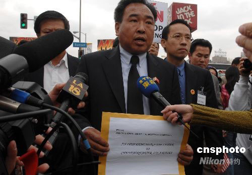 當?shù)貢r間4月19日上午,示威活動現(xiàn)場總指揮陳軍(中)準備向CNN遞交抗議信,但最終CNN方面無人出面接受抗議書。洛杉磯當天爆發(fā)十幾年來最大規(guī)模的華人華僑抗議示威活動。數(shù)千名華人華僑和留學(xué)生在CNN洛杉磯分部門前參加和平示威,要求CNN向公開鄭重道歉,并開除卡弗蒂。中新社發(fā) 張煒 攝