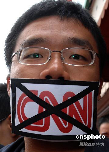當(dāng)?shù)貢r(shí)間4月19日上午,洛杉磯當(dāng)天爆發(fā)十幾年來(lái)最大規(guī)模的華人華僑抗議示威活動(dòng)。數(shù)千名華人華僑和留學(xué)生在CNN洛杉磯分部門前參加和平示威,要求CNN向公開(kāi)鄭重道歉,并開(kāi)除卡弗蒂。圖為一名抗議者戴著抗議CNN的口罩參加示威活動(dòng)。中新社發(fā) 張煒 攝