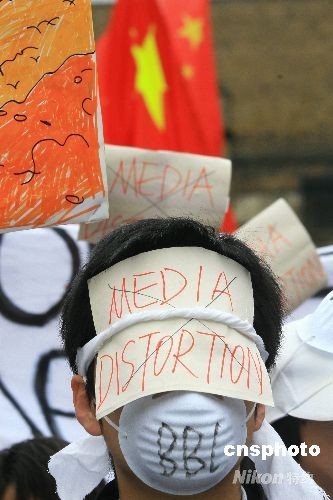 圖為一名示威者戴著口罩,抗議媒體歪曲報(bào)道。中新社發(fā) 李鵬 攝