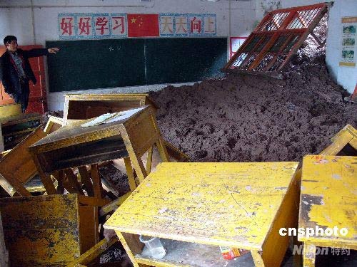 4月21日,湖北省興山縣小河村甘家坡特大山體滑坡現(xiàn)場。4月18日上午至20日凌晨,湖北興山縣出現(xiàn)持續(xù)暴雨天氣,最高降雨量達106毫米。19日下午5時30分,興山縣高陽鎮(zhèn)小河村甘家坡開始發(fā)生特大山體滑坡,截至20日10時,滑坡體體積達6萬立方米,形成2萬立方米泥石流。該滑坡體位于高陽鎮(zhèn)中心小學(xué)背后,泥石流沖垮學(xué)校后圍墻40米,推倒學(xué)生食堂1棟3間,涌入了1樓教室并蔓延至操場。幸虧事發(fā)時學(xué)生逢周末放假不在校,否則可能會導(dǎo)致群死群傷的災(zāi)難性后果。目前,又有2萬立方米滑坡體已經(jīng)變形,存在繼續(xù)下滑的可能,受特大滑坡及泥石流險情直接危及的高陽鎮(zhèn)中心小學(xué)已從21日起停課,甘家坡周邊37戶179人已撤出現(xiàn)場。中新社發(fā) 劉君鳳 攝