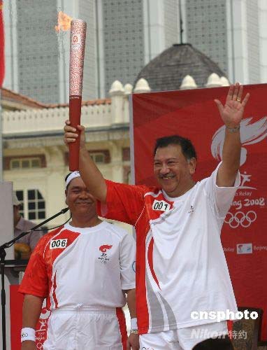 圖為第一棒火炬手、馬來西亞奧委會主席東姑伊姆拉展示“祥云”火炬。作者: 沈晨