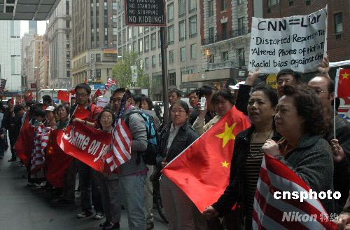 數(shù)百華僑華人及中國留學(xué)生二十一日在美國有限電視新聞網(wǎng)(CNN)駐紐約辦公大樓前游行,強(qiáng)烈抗議CNN辱華報道。中新社發(fā) 李靜 攝