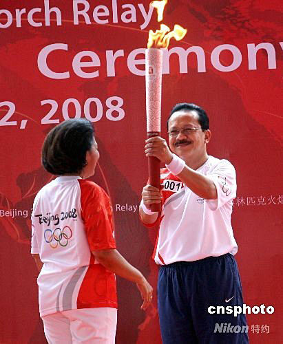 圖為雅加達(dá)站第一棒火炬手、雅加達(dá)特區(qū)省長法烏茲手(右)從印尼奧委會(huì)主席莉達(dá)手中接過火炬。作者: 沈晨