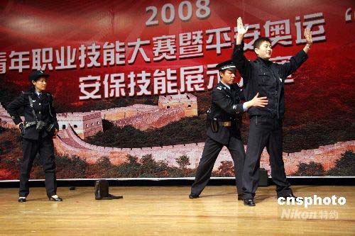 以“迎奧運、比技能、促振興”為主題的2008沈陽青年職業(yè)大賽開幕式暨奧運安保技能展示大賽4月24日在沈陽舉行。這次大賽充分展示沈陽市公安民警關注奧運、參與奧運、奉獻奧運的精神風貌,通過比賽將全面提升奧運安保人員的綜合素質(zhì)、執(zhí)法能力和實戰(zhàn)能力,打造一支高效率、高水平、符合奧運規(guī)則、體現(xiàn)國際水平的安保服務隊伍,確保沈陽賽區(qū)足球比賽順利進行。中新社發(fā) 趙敬東 攝