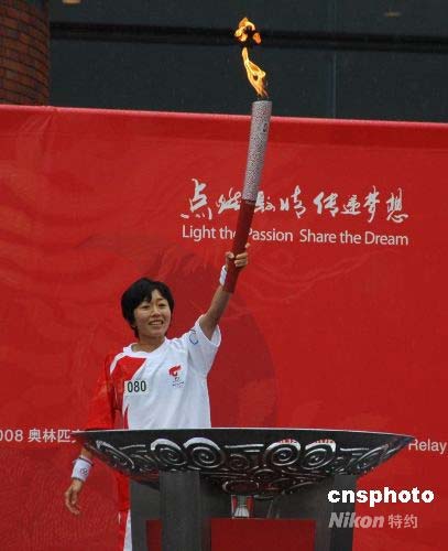 4月26日中午12時17分,北京奧運圣火長野傳遞活動中的最后一位火炬手--雅典奧運會女子馬拉松冠軍野口MIZUKI在展示火炬后點燃圣火盆。中新社發(fā) 關(guān)妍 攝