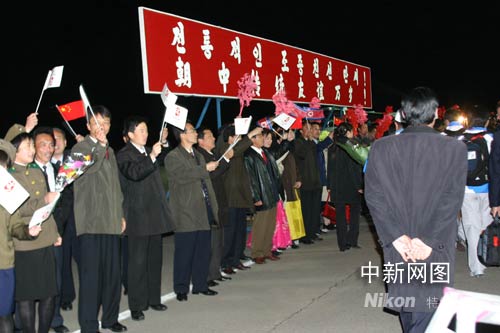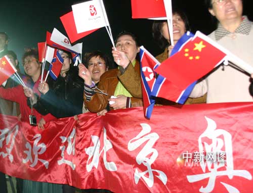 4月28日凌晨0時20分,載有北京奧運圣火的“奧運圣火號”平穩(wěn)地降落在平壤國際機場。朝鮮首都平壤是北京奧運圣火海外傳遞“和諧之旅”的第18站。這是奧運圣火自一九三六年開始傳遞活動以來,首次來到朝鮮。圖為朝鮮民眾在平壤國際機場迎接奧運圣火到來。沈晨 攝