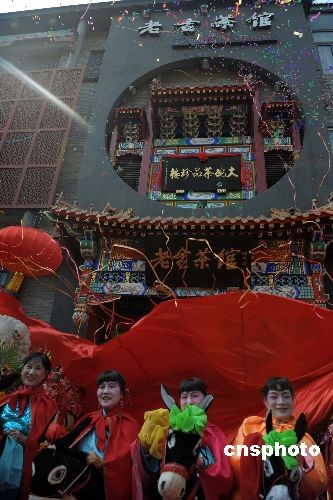 4月27日,為了迎接奧運(yùn)賓朋重裝一新的北京老舍茶館重新開(kāi)張。當(dāng)日,老舍茶館舉辦第五屆茶文化節(jié)。據(jù)了解,近期北京眾多餐飲等第三產(chǎn)業(yè)商戶重裝改造迎接北京奧運(yùn)所帶來(lái)的消費(fèi)熱潮。 中新社發(fā) 廖攀 攝