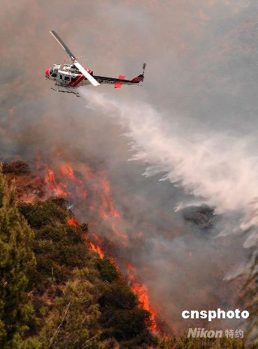 當(dāng)?shù)貢r間四月二十八日,消防直升機正在向著火區(qū)域撒下阻燃劑。洛杉磯近郊Sierra Madre的山林大火已經(jīng)燃燒了三天,過火面積近五百英畝,部分著火點距離居民區(qū)很近。當(dāng)天,當(dāng)?shù)刂行W(xué)全部停課,約一千名當(dāng)?shù)鼐用癖黄染o急撤離。這是當(dāng)?shù)厝嗄陙碜畲蟮纳搅执蠡稹O啦块T稱,美國聯(lián)邦、加州、洛杉磯縣和當(dāng)?shù)氐牧倜绬T正在現(xiàn)場滅火,至今沒有人員傷亡的報告。中新社發(fā) 張煒 攝