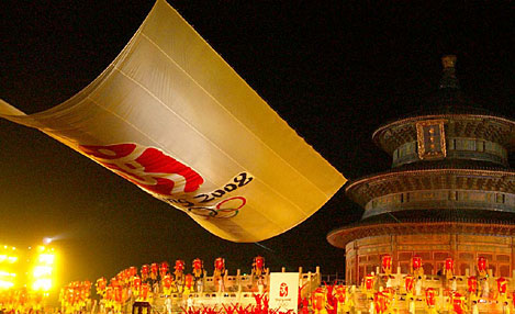 2003年8月3日,第29屆奧運(yùn)會(huì)會(huì)徽“中國印·舞動(dòng)的北京”發(fā)布儀式在北京天壇祈年殿舉行。(資料照片)