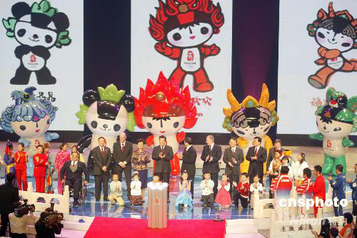 2005年11月11日晚,北京二零零八年奧運(yùn)會吉祥物發(fā)布暨倒計(jì)時一千天活動在北京工人體育館舉行,五個吉祥物福娃貝貝、福娃晶晶、福娃歡歡、福娃迎迎、福娃妮妮隆重登場。作者:盛佳鵬