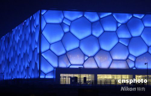 2008年1月19日晚,北京奧運工程之一的國家游泳館(“水立方”)進(jìn)行調(diào)試造型燈光,“水立方”中每個氣泡被照射上藍(lán)色燈光,令人暢想奧運水世界。中新社發(fā) 吳芒子 攝
