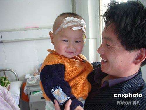 4月29日,阜陽市第二人民醫(yī)院,家長抱著已脫離生命危險的患兒在病房內(nèi)笑逐顏開。家住安徽省阜陽市潁泉區(qū)蘇屯鄉(xiāng)孟寨大隊(duì)1歲患兒劉暢,4月17日因發(fā)熱伴手足皮疹入住該醫(yī)院,當(dāng)時病情很嚴(yán)重,經(jīng)醫(yī)院專家會診調(diào)整治療方案,目前病情穩(wěn)定。4月29日上午,安徽省衛(wèi)生廳副廳長杜昌智在通報會上說,目前阜陽共報告腸道病毒EV71感染病例1520例,其中痊愈585例,經(jīng)全力搶救無效死亡20例,仍在住院治療412例,其中重癥患者26例。中新社發(fā) 張婭子 攝