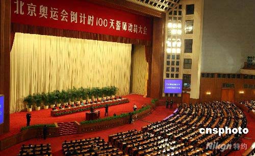 四月三十日,北京奧運(yùn)會倒計(jì)時(shí)100天誓師大會在人民大會堂舉行。 中新社發(fā) 任海霞 攝