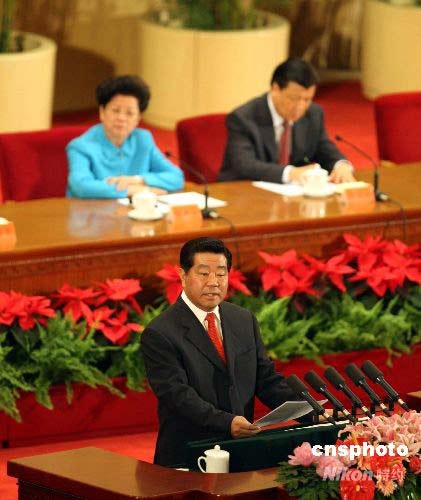 賈慶林在北京奧運會倒計時100天誓師大會上致辭。中新社發(fā) 任海霞 攝