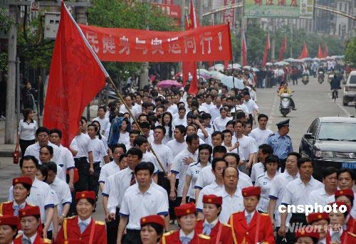4月30日,南康市民參加健步行。當(dāng)天是北京奧運會倒計時100天,江西南康市舉行了“慶五一,迎奧運,樹新風(fēng),促和諧”職工萬人健步行活動,慶!拔逡弧眹H勞動節(jié),迎接北京奧運會。 中新社發(fā) 許朝陽 攝
