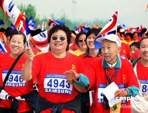 北京奧運(yùn)會(huì)倒計(jì)時(shí)100天群眾馬拉松接力活動(dòng)暨2008年北京國際長跑節(jié),4月30日上午在北京國家體育場公共區(qū)隆重舉行。中新社發(fā) 宋吉河 攝