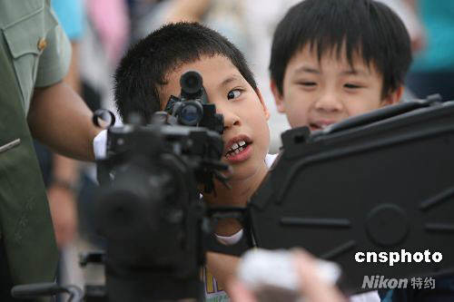 圖為一名小朋友在輕武器展示區(qū)認(rèn)真瞄準(zhǔn)目標(biāo)。中新社發(fā) 武仲林 攝