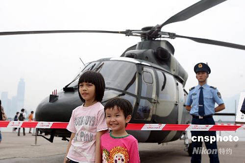 圖為市民在昂船洲軍營與軍用直升機(jī)合影。中新社發(fā) 武仲林 攝