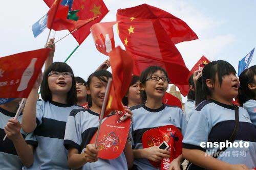 圖為學(xué)生們在街頭為傳遞活動加油助威。中新社發(fā) 武仲林 攝