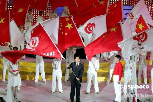 北京奧組委主席劉淇為志愿服務(wù)總團(tuán)授旗。中新社發(fā) 張宇 攝