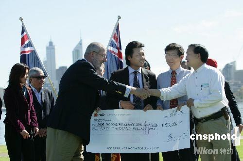 13個西澳華人社團(tuán)的代表向西澳參加北京奧運(yùn)的運(yùn)動員捐贈了五萬澳幣(近四十萬人民幣),表達(dá)西澳洲華人對澳大利亞體育事業(yè)的支持。 中新社發(fā) 高周丹 攝