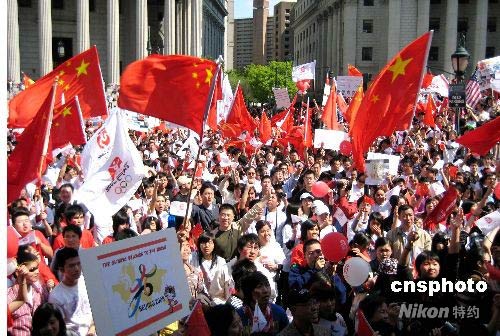 5月4日,紐約地區(qū)的華人華僑、留學(xué)生在曼哈頓弗利廣場(chǎng)舉行聲勢(shì)浩大的“和平奧運(yùn)”集會(huì),約萬人參加了當(dāng)天的集會(huì)活動(dòng)。中新社發(fā) 鄧悅 攝