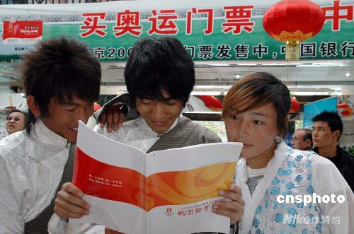 5月5日上午,北京奧運會第三階段門票開始在拉薩銷售,該銷售工作與全國同步進行。奧運會門票的銷售,引起了拉薩市民的極大熱情。在西藏奧運會門票銷售點的中國銀行西藏自治區(qū)分行里,購買奧運會門票的市民排起了長長的隊伍。圖為西藏大學(xué)的學(xué)生在看購票參考手冊。 中新社發(fā) 周波 攝