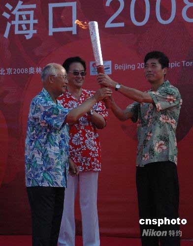 圖:奧運(yùn)圣火使者何振梁在海口傳遞火炬