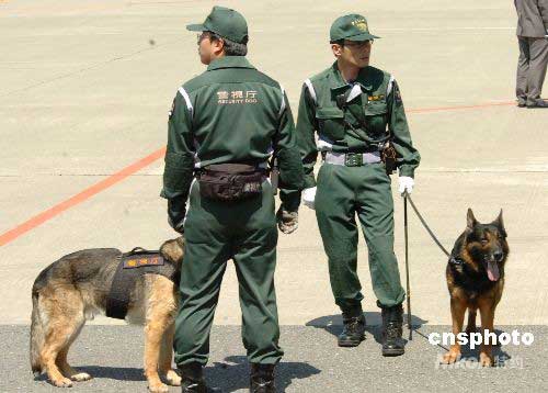 當(dāng)?shù)貢r間5月6日下午1點45分左右,中國國家主席胡錦濤乘專機抵達日本羽田機場,開始對其為期5天的國事訪問。據(jù)日媒報道,日本政府動用數(shù)千警力為此次的“暖春之旅”保駕護航。圖為在羽田機場執(zhí)勤的日警衛(wèi)人員與警犬。中新社發(fā) 朱沿華 攝