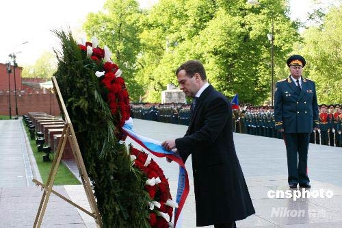 俄羅斯新任總統(tǒng)梅德韋杰夫來(lái)到克里姆林宮西北側(cè)紅墻下的亞歷山大花園,向無(wú)名烈士墓敬獻(xiàn)花圈,紀(jì)念衛(wèi)國(guó)戰(zhàn)爭(zhēng)勝利63周年。這是梅德韋杰夫就任總統(tǒng)后的首場(chǎng)正式活動(dòng)。中新社發(fā) 田冰 攝