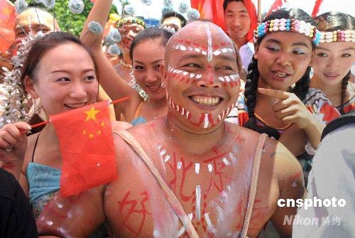 圖為世界之窗的外國(guó)演員在道旁歡呼圣火傳遞。 中新社發(fā) 廖攀 攝