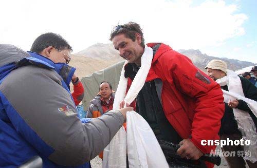 5月9日,在親眼目睹了奧運圣火在珠峰傳遞的盛舉后,6家受邀的境外媒體的記者離開珠峰大本營絨布新聞中心,將奔赴北京。境外記者、北京奧組委的官員和工作人員、受邀的境內(nèi)記者和本次活動的組織者道別,西藏自治區(qū)黨委宣傳部常務副部長、珠峰新聞中心主任沈開運前來送行。圖為工作人員向境外記者獻上了潔白的哈達。中新社發(fā) 盛佳鵬 攝
