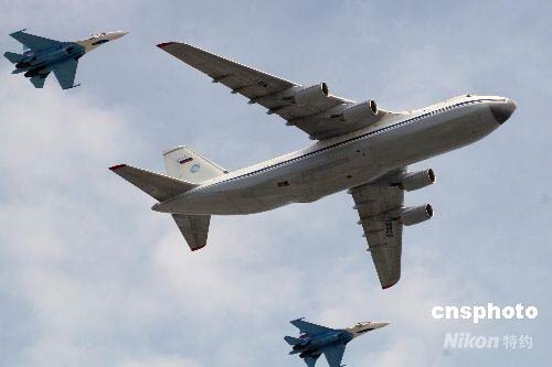 圖為飛機(jī)編隊(duì)飛臨紅場(chǎng)上空。當(dāng)天俄軍展示了30余種新式戰(zhàn)機(jī)。中新社發(fā) 田冰 攝