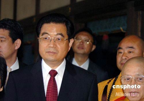 圖為胡錦濤在唐招提寺長(zhǎng)老的陪同下參觀御影堂。中新社發(fā) 朱沿華 攝