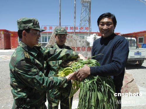5月10日,青藏高原行車的中國汽車兵路過位于青海省可可西里國家自然保護(hù)區(qū)的索南達(dá)杰保護(hù)站,把新鮮的蔬菜和副食品送到工作人員手中。中新社發(fā) 吳蘇琳 攝