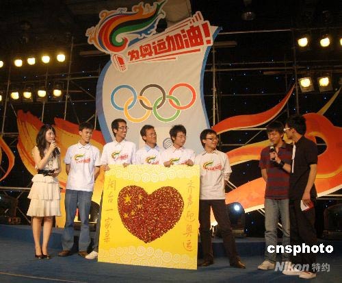 2008年5月11日,臺灣學(xué)子在展示為奧運會創(chuàng)作的祝福禮物。當日,為了慶祝北京奧運會圣火在福州成功傳遞, 閩臺學(xué)子牽手兩岸共迎奧運圣火活動舉行。 中新社發(fā) 張 斌 攝