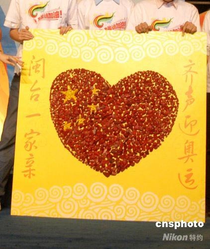 5月11日,臺灣學(xué)子在展示為奧運(yùn)會(huì)創(chuàng)作的祝福禮物。中新社發(fā) 張 斌 攝