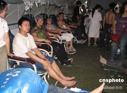 5月12日下午,四川汶川縣發(fā)生7.8級地震,成都也受到波及。位于成都北郊的成都軍區(qū)總醫(yī)院接收了來自地震災(zāi)區(qū)的100多名傷員。在積極組織搶救的同時,醫(yī)院搭建10余頂大型帳篷,將住院的1000多名患者全部安全轉(zhuǎn)移。中新社發(fā) 朱琥 攝