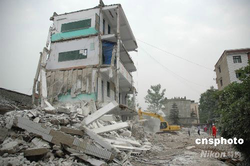 12日下午2:30左右,受四川汶川地震波及,重慶市梁平縣文化鎮(zhèn)一小學教學樓發(fā)生垮塌。13日凌晨1時許,搜救工作已全部結(jié)束,垮塌造成5人死亡,36人受傷。圖為垮塌后小學僅剩的幾間房屋。 中新社發(fā) 郭虹 攝