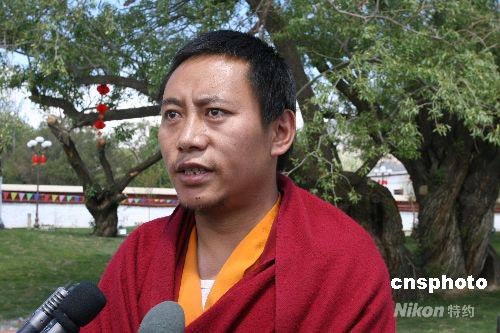 四川汶川大地震發(fā)生后,引起西藏宗教界極大關(guān)注,5月13日,拉薩哲蚌寺部分僧人代表在參觀完“三·一四”暴力事件中被燒毀的拉薩市第二中學教學樓、被毀店鋪和新改近造完工的羅布林卡廣場等處后表示,明天該寺將舉行主題祈福法會,為四川汶川地震災區(qū)民眾祈福。圖為僧人平措塔青在祝福災區(qū)民眾。中新社發(fā) 柳俊武 攝