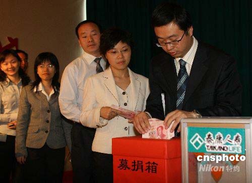 5月13日,北京各界向中國紅十字總會捐款,為地震災區(qū)人民獻愛心。中新社發(fā) 燕平 攝