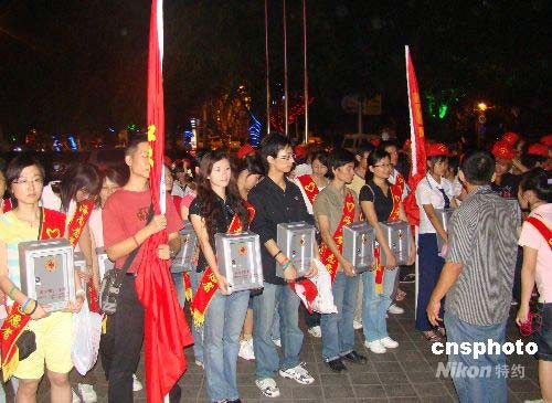 5月13日晚上八點,由海南青年志愿者協(xié)會、省紅十會、志愿海南愛心分社和海南電視臺《鷯哥》欄目組織30多位自愿者,走上街頭為四川地震災區(qū)募捐善款。圖務(wù)志愿者作出發(fā)募捐前的準備。中新社發(fā) 付美斌 攝