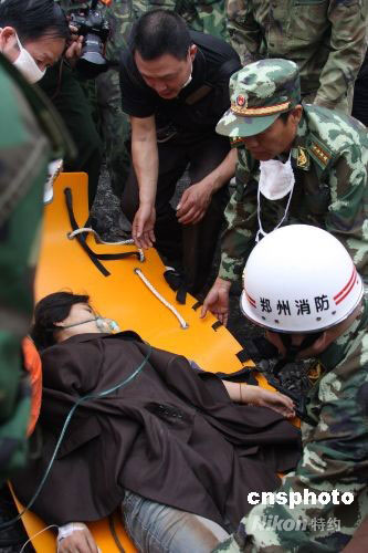 5月14日,在四川什邡市鎣華鎮(zhèn)救災(zāi)的武警鄭州消防支隊(duì)100多名官兵,用7個(gè)小時(shí)救出一名被廢墟掩埋了3天的工人。