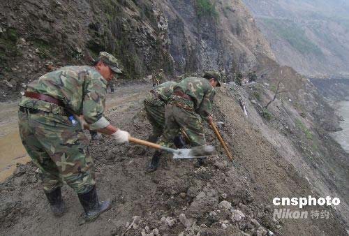 武警在搶修到汶川縣映秀鎮(zhèn)的公路。中新社發(fā) 郭國權(quán) 攝
