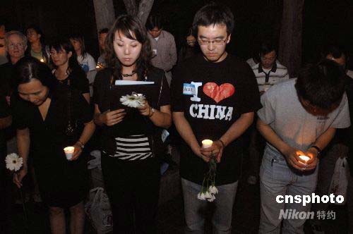 當(dāng)?shù)貢r(shí)間五月十六日晚,洛杉磯中國(guó)留學(xué)生和學(xué)者等兩百多人在加州大學(xué)洛杉磯分校舉行燭光追思會(huì),悼念四川大地震死難同胞,并向?yàn)?zāi)區(qū)捐獻(xiàn)愛心。中新社發(fā) 張煒 攝