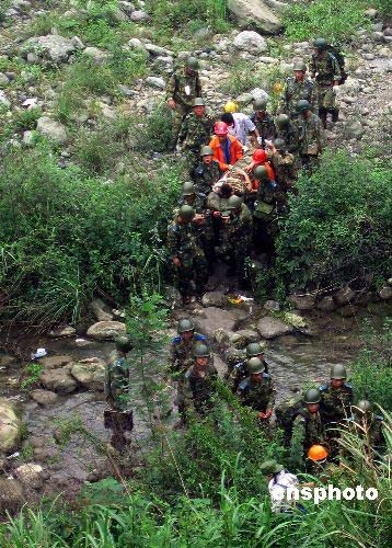 16日上午,師政治部主任高鵬帶領(lǐng)救援突擊隊(duì)和醫(yī)療小分隊(duì)172人,從綿竹市漢旺鎮(zhèn)出發(fā)向重災(zāi)區(qū)天池鄉(xiāng)幾個(gè)村里運(yùn)送救援物資,幫助群眾撤離震區(qū)。11時(shí)左右,當(dāng)部隊(duì)行至高橋以西500米處,突然發(fā)生余震,導(dǎo)致大量山石從山頂傾斜而下,直接威脅著正在這個(gè)路段通過(guò)的群眾。作訓(xùn)參謀祝紅杰突然發(fā)現(xiàn)一個(gè)孩子癱倒在石堆上,急忙上前搶抱他,孩子得救了,祝紅杰卻被亂石砸斷左腿,當(dāng)場(chǎng)倒地。作訓(xùn)參謀胡國(guó)才眼見一塊亂石砸向老人,極力將老人推到一邊,自己的頭部卻被亂石砸傷暈倒在地。同時(shí),該團(tuán)還有一名司務(wù)長(zhǎng)和兩名戰(zhàn)士在救援中被泥石流砸傷…… 看到解放軍為救災(zāi)區(qū)群眾身負(fù)重傷,在現(xiàn)場(chǎng)的一些救災(zāi)志愿者迅即投入搶救部隊(duì)官兵的行動(dòng)中。運(yùn)送途中山路險(xiǎn)峻,他們拉一把、推一把,爭(zhēng)先恐后出把力氣。擔(dān)負(fù)救援撤離群眾任務(wù)的重慶市高新區(qū)人民醫(yī)院的醫(yī)護(hù)人員聞?dòng)嵑螅贿吜髦鵁釡I,一邊實(shí)施現(xiàn)場(chǎng)救護(hù),為他們贏得了寶貴的救治時(shí)機(jī)……