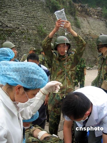16日上午,師政治部主任高鵬帶領(lǐng)救援突擊隊(duì)和醫(yī)療小分隊(duì)172人,從綿竹市漢旺鎮(zhèn)出發(fā)向重災(zāi)區(qū)天池鄉(xiāng)幾個村里運(yùn)送救援物資,幫助群眾撤離震區(qū)。11時左右,當(dāng)部隊(duì)行至高橋以西500米處,突然發(fā)生余震,導(dǎo)致大量山石從山頂傾斜而下,直接威脅著正在這個路段通過的群眾。作訓(xùn)參謀祝紅杰突然發(fā)現(xiàn)一個孩子癱倒在石堆上,急忙上前搶抱他,孩子得救了,祝紅杰卻被亂石砸斷左腿,當(dāng)場倒地。作訓(xùn)參謀胡國才眼見一塊亂石砸向老人,極力將老人推到一邊,自己的頭部卻被亂石砸傷暈倒在地。同時,該團(tuán)還有一名司務(wù)長和兩名戰(zhàn)士在救援中被泥石流砸傷…… 看到解放軍為救災(zāi)區(qū)群眾身負(fù)重傷,在現(xiàn)場的一些救災(zāi)志愿者迅即投入搶救部隊(duì)官兵的行動中。運(yùn)送途中山路險(xiǎn)峻,他們拉一把、推一把,爭先恐后出把力氣。擔(dān)負(fù)救援撤離群眾任務(wù)的重慶市高新區(qū)人民醫(yī)院的醫(yī)護(hù)人員聞訊后,一邊流著熱淚,一邊實(shí)施現(xiàn)場救護(hù),為他們贏得了寶貴的救治時機(jī)……